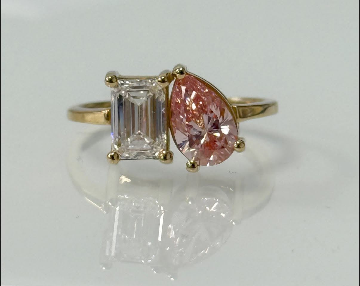 This ring features a one carat white emerald cut lab grown diamond and one carat pink lab diamond pear shape set in 14k yellow gold. Can be sized for a fee.